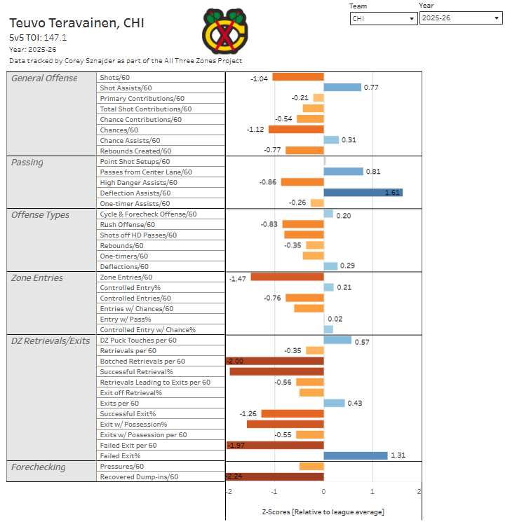 If you're not sure how to read that, let me help. The blue lines going to the right indicate above average. The orange indicates below average. The "middle" is 0, or average across the NHL. Teuvo has a lot of below-average marks according to All Three Zones data.