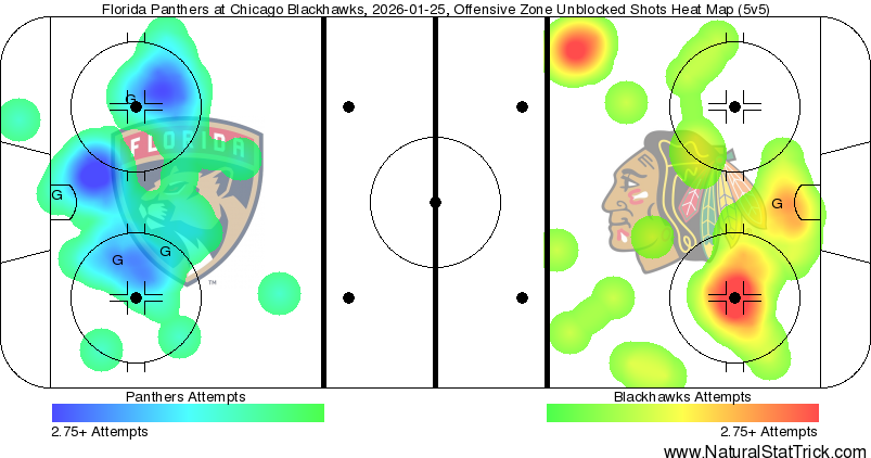 The Florida Panthers' defense prevented the Blackhawks from getting to the middle of the ice. The heat map below shows how Chicago was pushed outside of the slot for most of their 5v5 shot attempts. In fact, the only goal the Hawks scored was because Wyatt Kaiser held the blue line and forced a turnover with the Panthers defense scrambling to get back in their zone. Tyler Bertuzzi had all the space in the world to score.