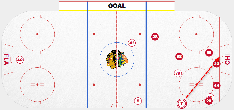 Spencer Knight let this one trickle past the goal line after he couldn't hold Mackie Samoskevich's shot. The Hawks gave Samoskevich the space to get open for the wrist shot. Artyom Levshunov made a poor outlet pass, which turned the puck over to Florida. Andre Burakovsky arguably was more at fault than Levshunov, as he wasn't paying attention. Gustav Forsling (FLA42) rimmed the puck around to Samoskevich (FLA11), and the Hawks were swirled in their zone like little meatballs.